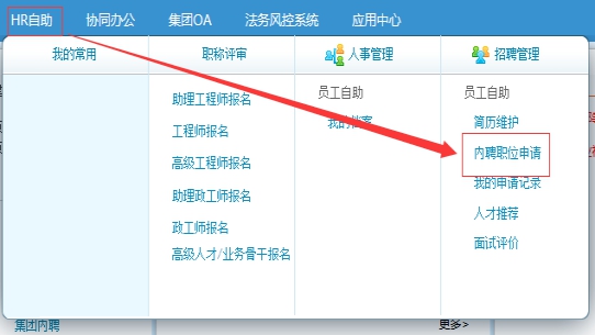 (一)福能集團內應聘人員必須獲得所在單位同意,請通過個人門戶賬號登陸福能集團企業門戶:http://10.1.12.15:83/portal,并參照下圖所示路徑進入職位申請界面,選擇相應的職位在線報名填寫《應聘人員登記表》。