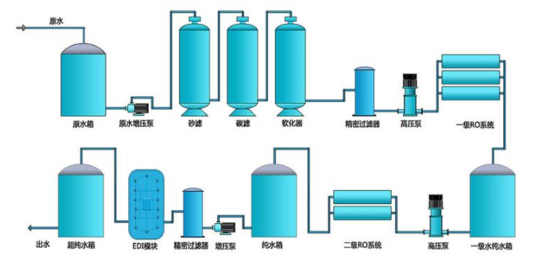 君浩環保集團的技術人員結合原水的水質情況和行業水質標準,為其設計了如下工藝流程: