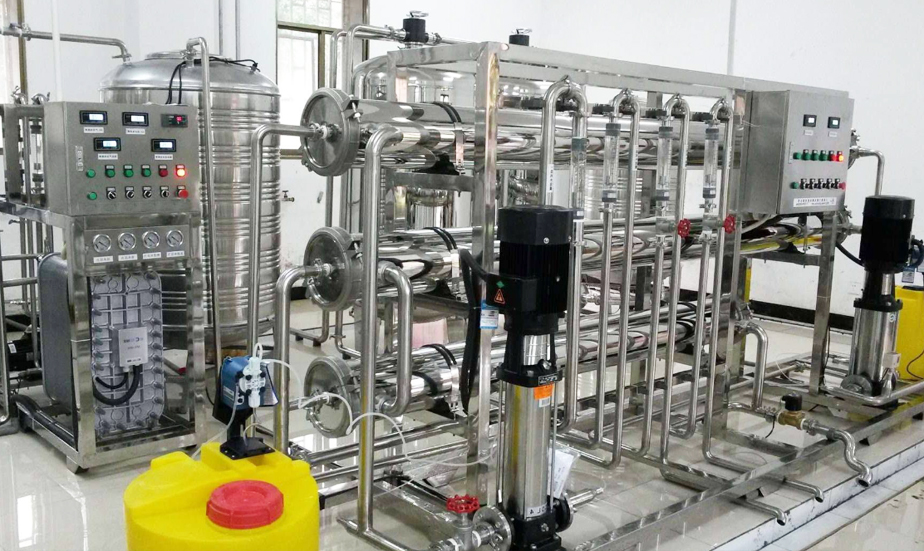 原水箱→增壓泵→石英砂過濾器→活性炭過濾器→阻垢加藥系統→精密過濾器→高壓泵→雙級反滲透主機→EDI裝置→變頻供水→用水點