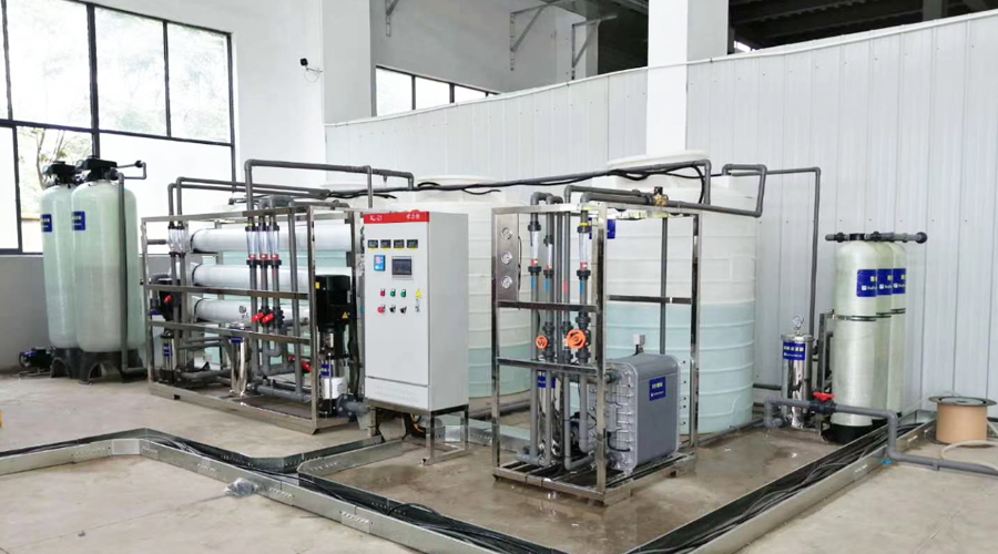 原水箱→增壓泵→石英砂過濾器→活性炭過濾器→阻垢加藥裝置→精密過濾器→高壓泵→雙級反滲透主機→edi裝置→拋光混床→純水箱