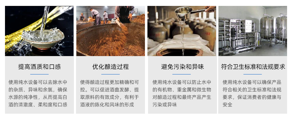 白酒中水的含量非常高,如果使用未經處理的自來水或地下水,其中可能存在各種雜質和微生物等,這些物質會影響酒的風味和品質。而使用純水設備可以有效去除水中的雜質、微生物和化學物質,使得生產出的白酒口感更好,品質更為純正