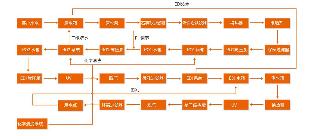 EDI的作用就是通過除去電解質(包括弱電解質)的過程,將水的電阻率從0.05~1.0MΩ·cm提高到5~16MΩ·cm