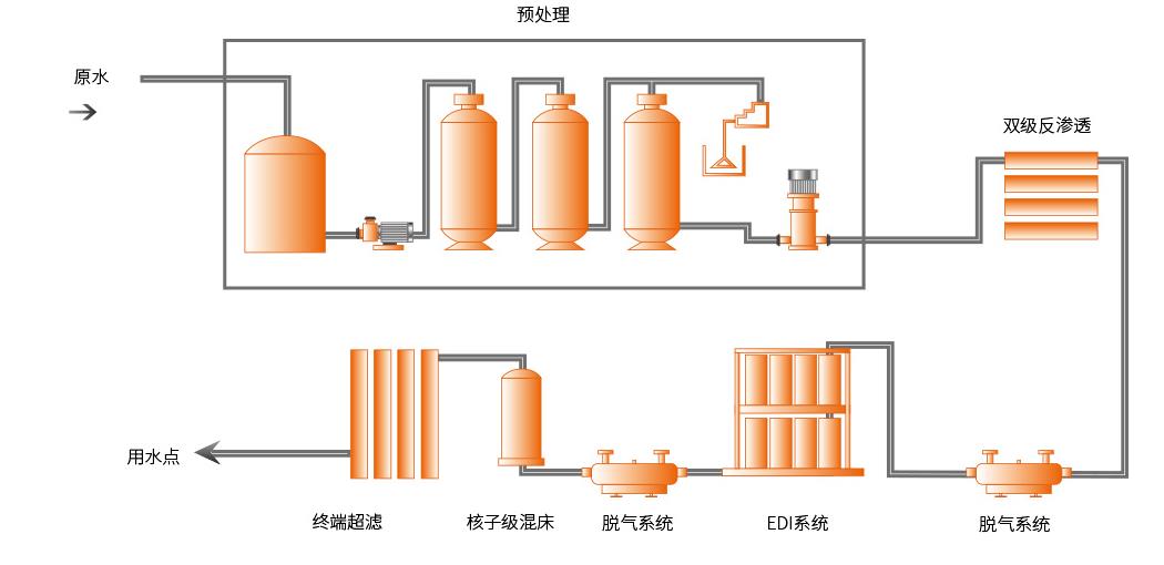 終端超濾:有效地去除水中的微粒、膠體、細菌、熱源和有機物力。是整套系統最后的防火墻,確保產出的高純水不受二次污染。