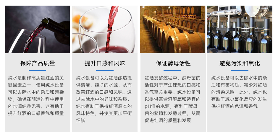 紅酒生產使用純水主要是為了保證產品的質量和穩定性。紅酒是一種易受外界環境和物質影響的產品,水作為紅酒制作中的重要組成部分,對于紅酒的品質和口感有著至關重要的影響。使用純水可以避免水中可能存在的雜質、異味和微生物等對紅酒的污染,從而保證紅酒的天然香氣和味道不被破壞。