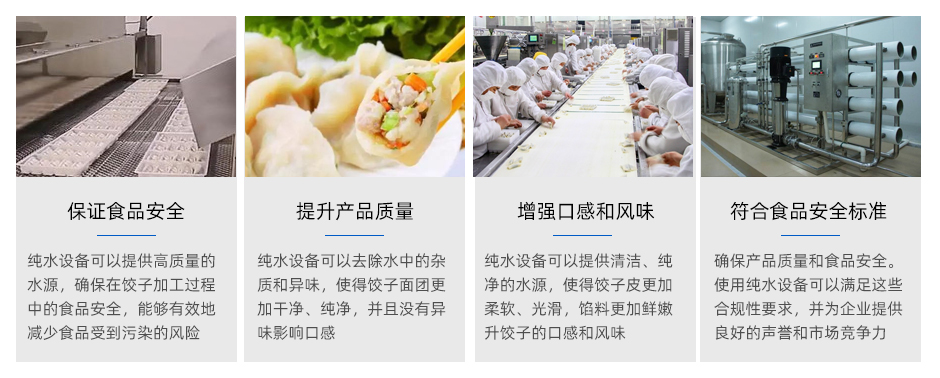 餃子生產過程中需要大量清洗、攪拌、蒸煮等操作。在這些操作中,水的質量和純度對于餃子的品質和口感有很大影響。使用自來水或其他不經過處理的水源可能會含有各種雜質和污染物,如氯、鐵銹、硬度等,如果直接用來制作餃子,不僅會影響餃子的口感和顏色,還會對人體健康造成危害。而采用純水設備可以去除這些污染物,保證水質的純凈和安全。